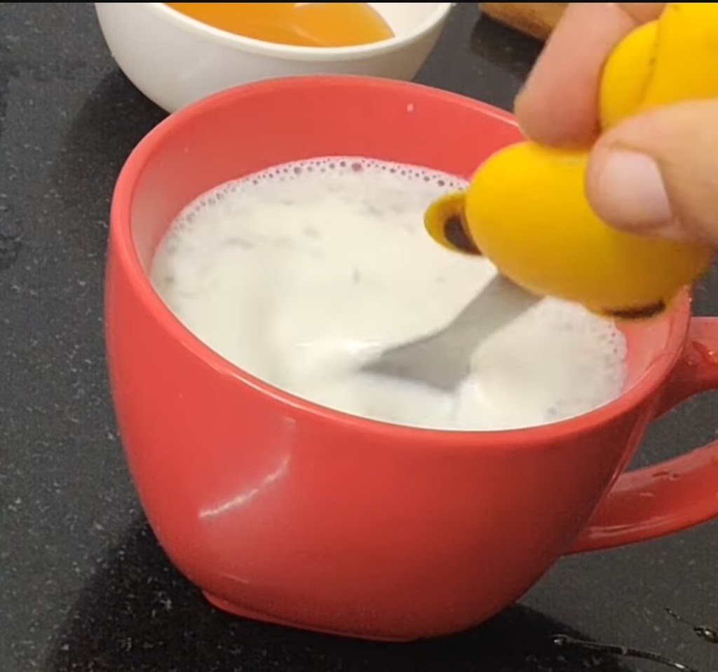 După ce a fiert turnăm lapte într-o ceașcă și lăsăm un pic sa se răcească apoi punem un pic de scorțișoară măcinată și un pic de nucșoară.