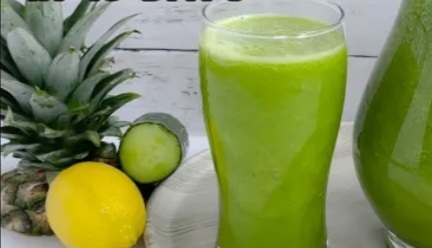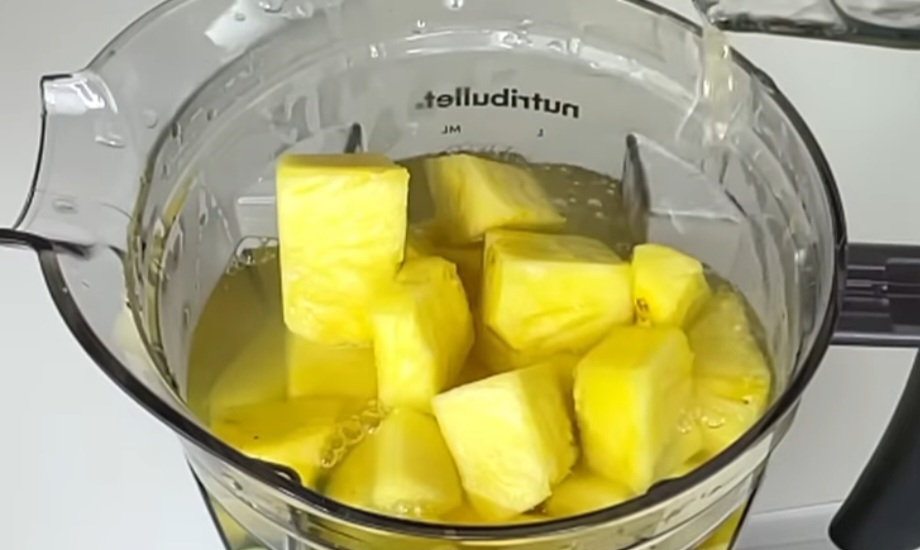 Într-un blender punem ghimbirul, castravetele, ananasul taiat cuburi, zeama in care au fiert cojile de ananas, și zeama de lămâie. Totul se blendează.